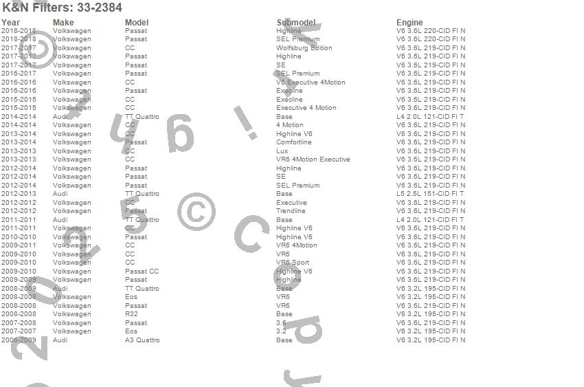 Below is an abbreviated list of applications for the Air Filter.