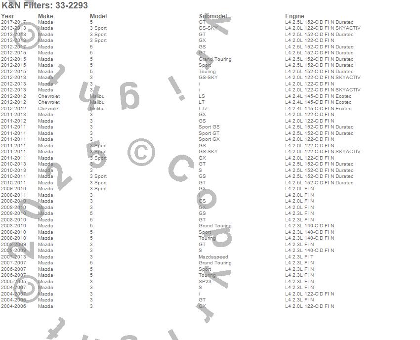 Below is an abbreviated list of applications for the Air Filter.