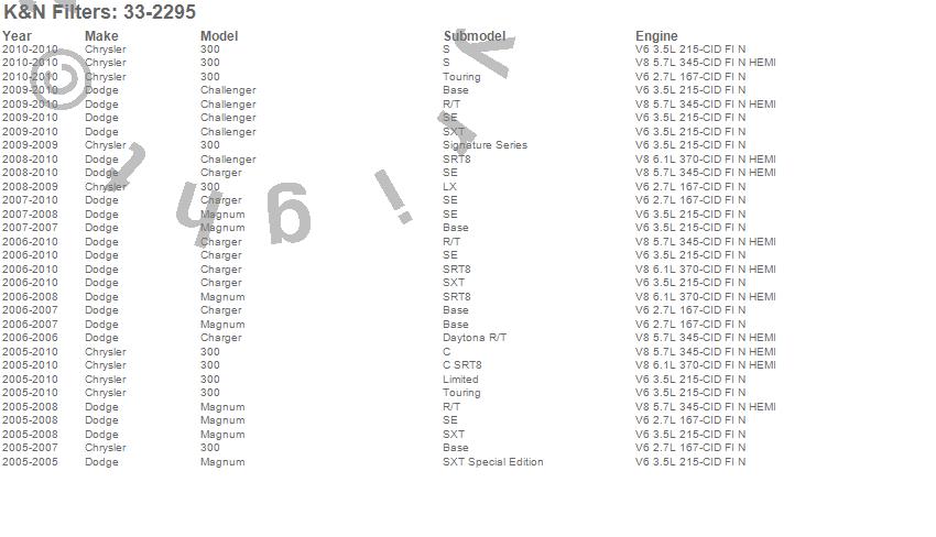 Below is an abbreviated list of applications for the Air Filter.