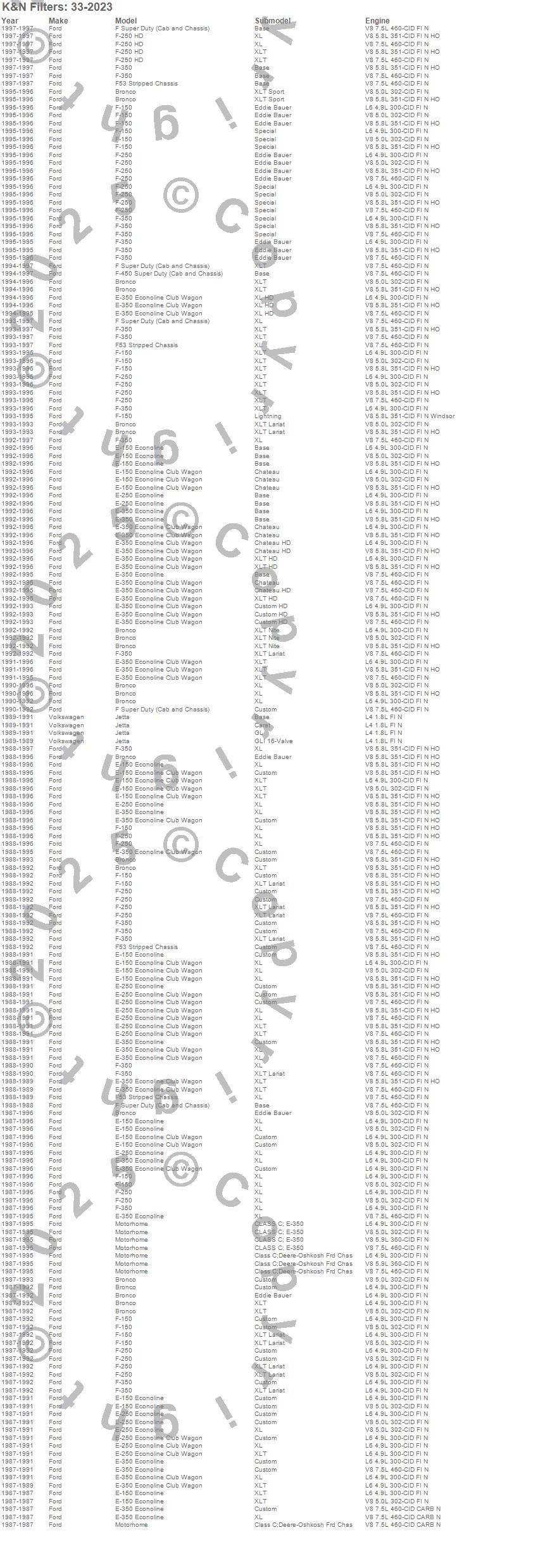 Below is an abbreviated list of applications for the Air Filter.