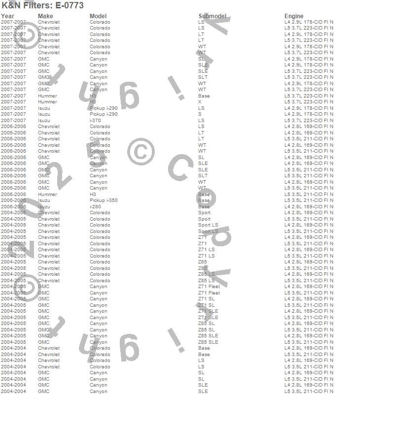 Below is an abbreviated list of applications for the Air Filter.
