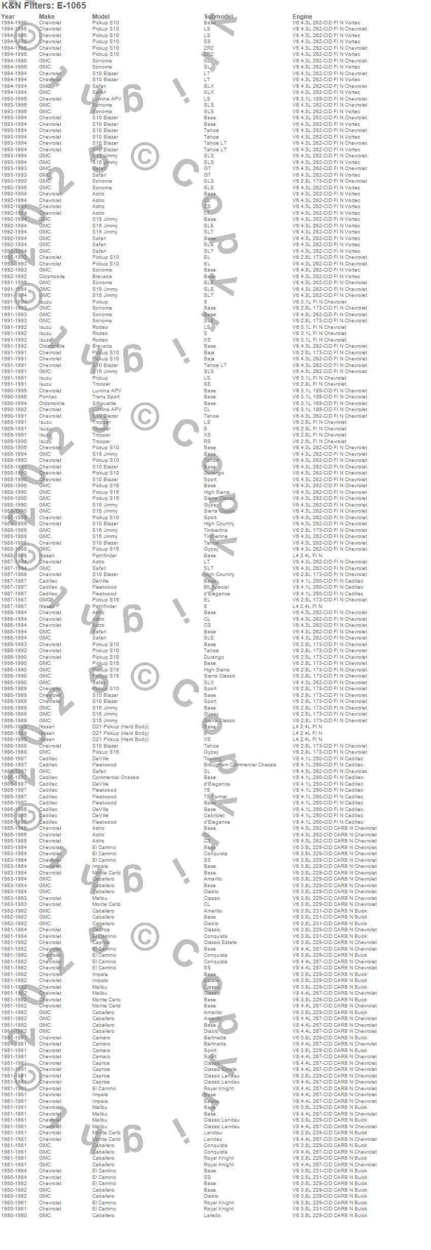 Astro, Bravada, Caballero, Camaro, Caprice, Commercial Chassis, D21 Pickup (Hard Body), DeVille, El Camino, Fleetwood, Impala, Lumina APV, Malibu, Monte Carlo, Pathfinder, Pickup, Rodeo, S10 Blazer, S10 Pickup, S15 Jimmy