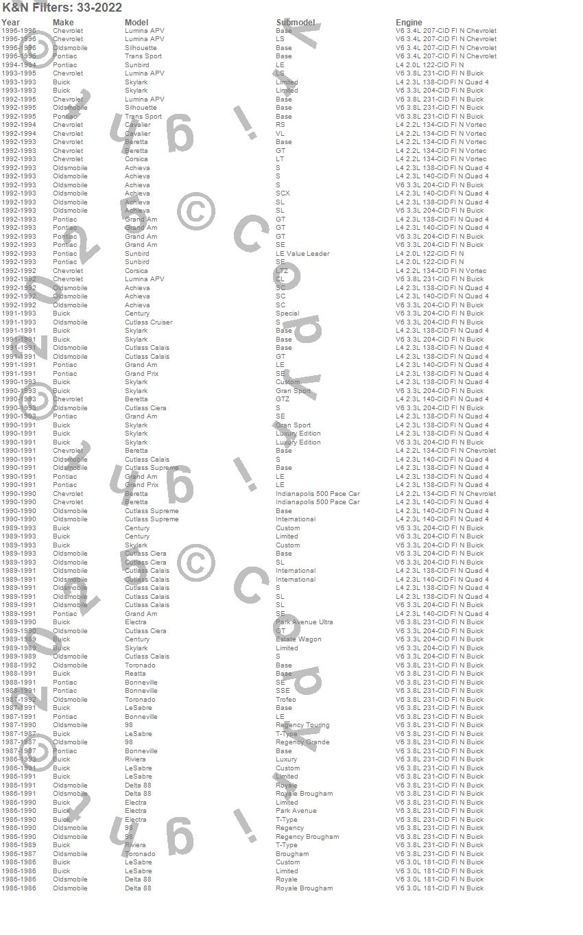 98, Achieva, Beretta, Bonneville, Cavalier, Century, Corsica, Cutlass Calais, Cutlass Ciera, Cutlass Cruiser, Cutlass Supreme, Delta 88, Electra, Grand Am, Grand Prix, LeSabre, Lumina APV, Reatta, Riviera, Silhouette