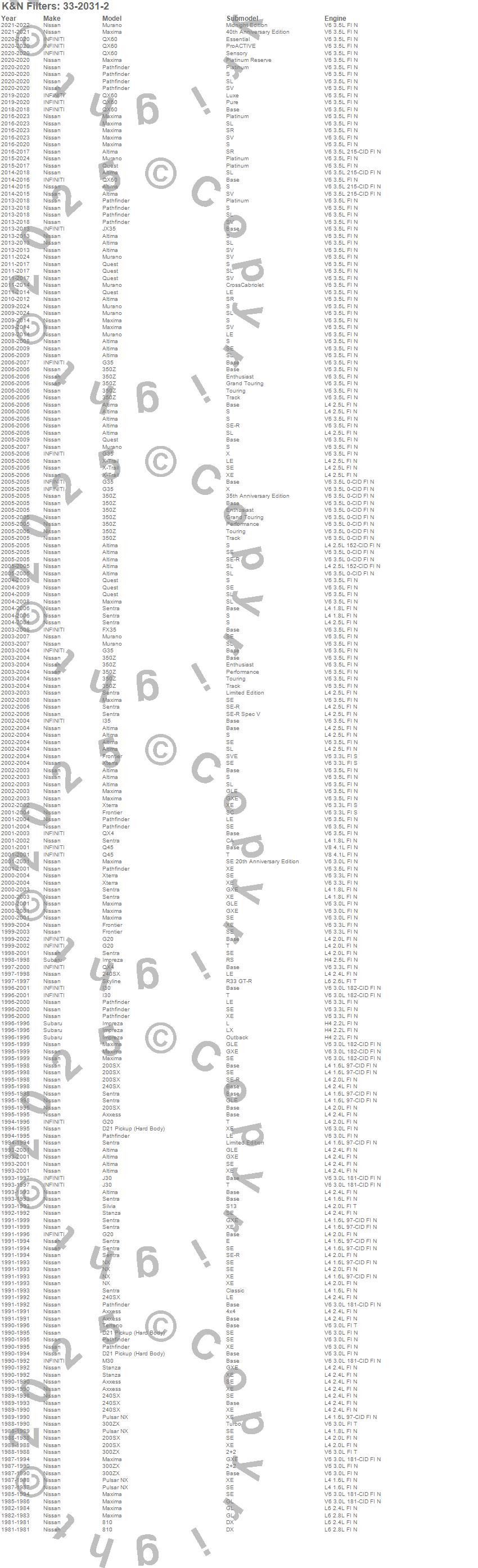 200SX, 240SX, 300ZX, 350Z, 810, Altima, Axxess, D21 Pickup (Hard Body), Frontier, FX35, G20, G35, I30, I35, Impreza, J30, JX35, M30, Maxima, Murano