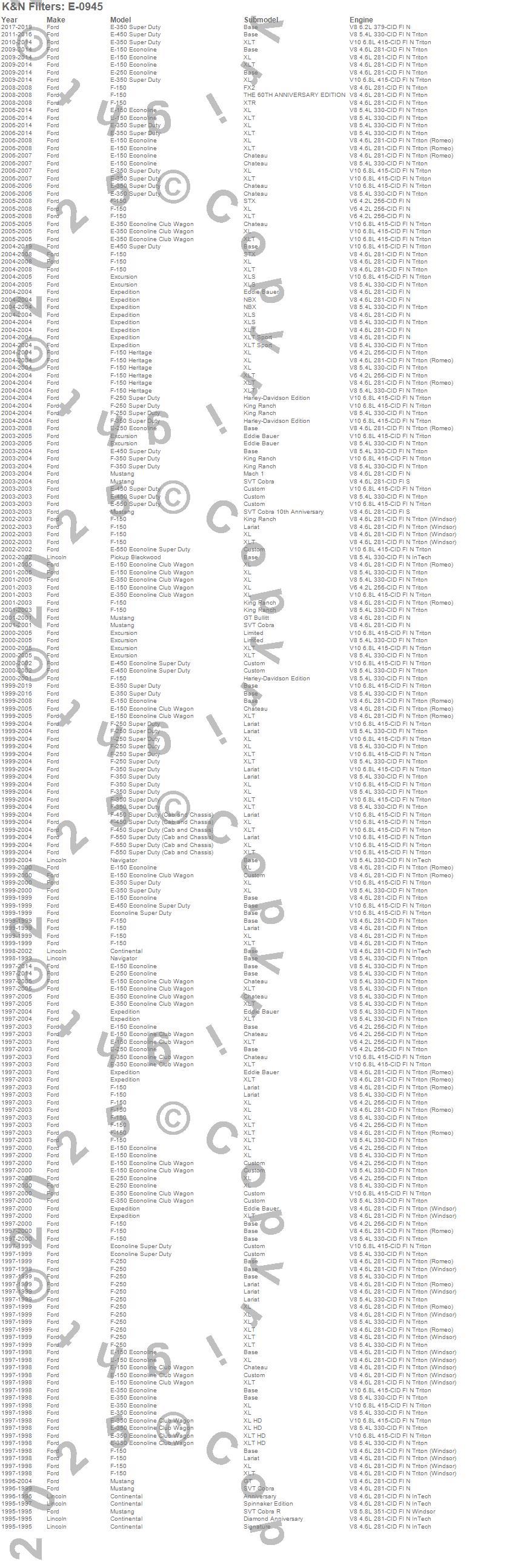 Blackwood, Continental, E-150 Econoline, E-150 Econoline Club Wagon, E-250 Econoline, E-350 Econoline, E-350 Econoline Club Wagon, E-350 Super Duty, E-450 Econoline Super Duty, E-450 Super Duty, E-550 Econoline Super Duty, E-550 Super Duty, Econoline Super Duty, Excursion, Expedition, F-150, F-150 Heritage, F-250, F-250 Super Duty, F-350 Super Duty