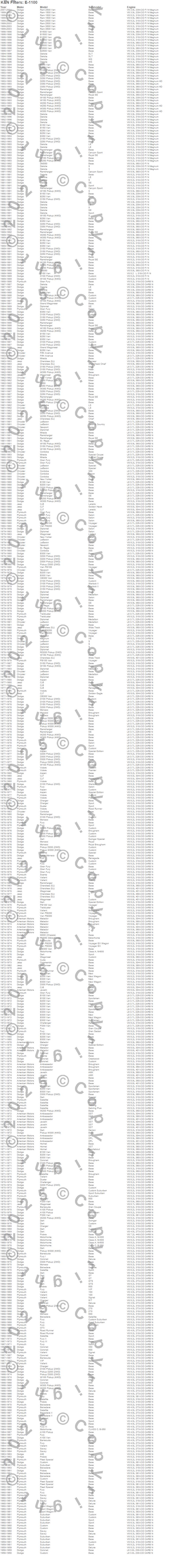 440, A100 Pickup, A100 Van, Ambassador, Aspen, B100 Van, B150 Van, B1500 Van, B200 Van, B250 Van, B2500 Van, B300 Van, B350 Van, B3500 Van, Barracuda, Belvedere, Belvedere II, CB300 Van, Challenger, Charger