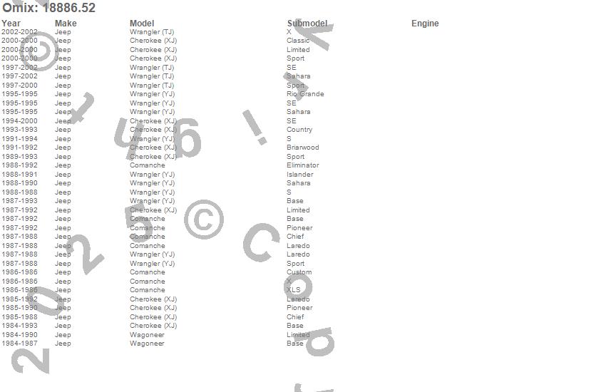 Cherokee (XJ), Comanche, Wagoneer, Wrangler (TJ), Wrangler (YJ), Jeep, 2002, 2001, 2000, 1999, 1998, 1997, 1996, 1995, 1994, 1993, 1992, 1991, 1990, 1989