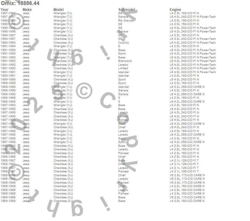 Cherokee (XJ), Wrangler (TJ), Wrangler (YJ), Jeep, 1997, 1996, 1995, 1994, 1993, 1992, 1991, 1990, 1989, 1988, 1987, 1986, 1985, 1984