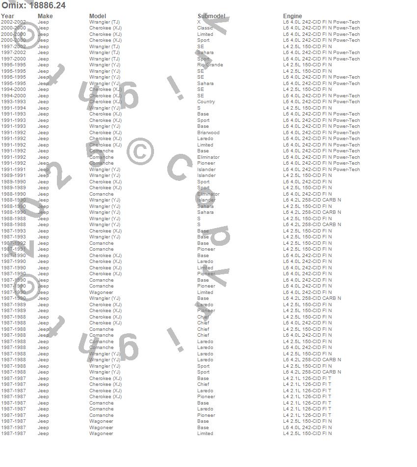 Cherokee (XJ), Comanche, Wagoneer, Wrangler (TJ), Wrangler (YJ), Jeep, 2002, 2001, 2000, 1999, 1998, 1997, 1996, 1995, 1994, 1993, 1992, 1991, 1990, 1989