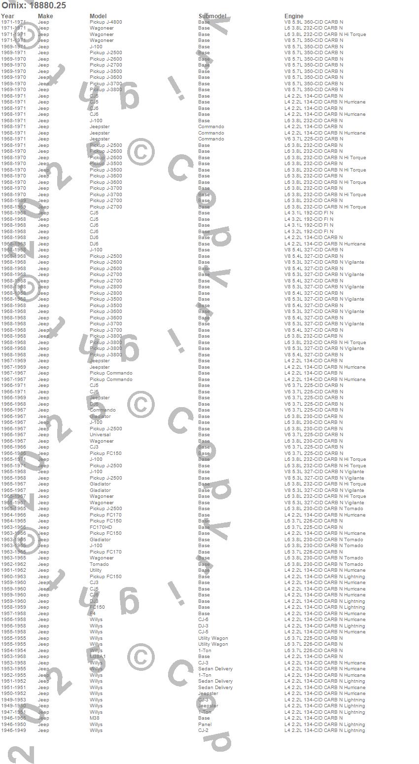 CJ3, CJ5, CJ6, Commando, DJ3, DJ6, F4, FC150, FC170, FC170HD, Gladiator, J-100, J-2500, J-2600, J-2700, J-2800, J-3500, J-3600, J-3700, J-3800