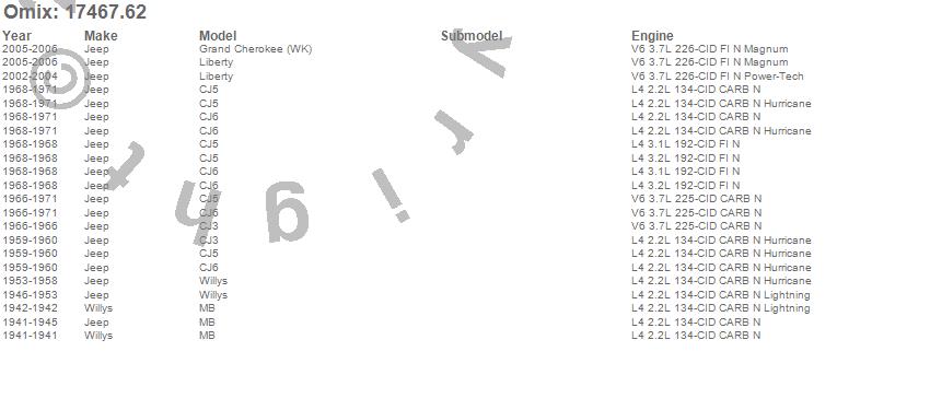 CJ3, CJ5, CJ6, Grand Cherokee (WK), Liberty, MB, Willys, Jeep, Willys, 2006, 2005, 2004, 2003, 2002, 1971, 1970, 1969, 1968, 1967, 1966