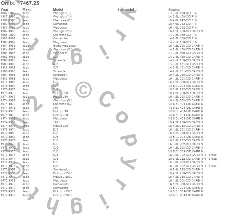 Cherokee (SJ), Cherokee (XJ), CJ5, CJ6, CJ7, Comanche, Commando, DJ5, Grand Wagoneer, J-2500, J-2600, J10, J20, Scrambler, Wagoneer, Wrangler (TJ), Wrangler (YJ), Jeep, 2002, 2001