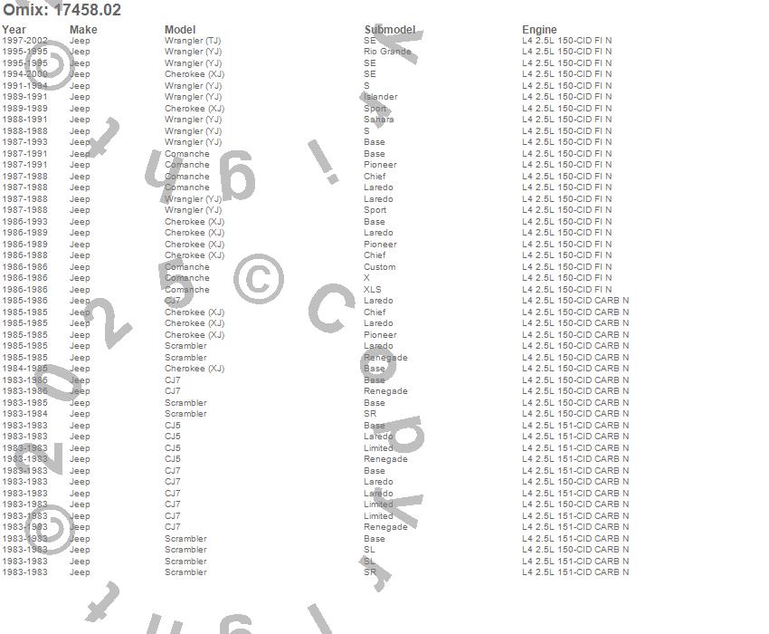 Cherokee (XJ), CJ7, Comanche, Scrambler, Wagoneer, Wrangler (TJ), Wrangler (YJ), Jeep, 2002, 2001, 2000, 1999, 1998, 1997, 1996, 1995, 1994, 1993, 1992, 1991