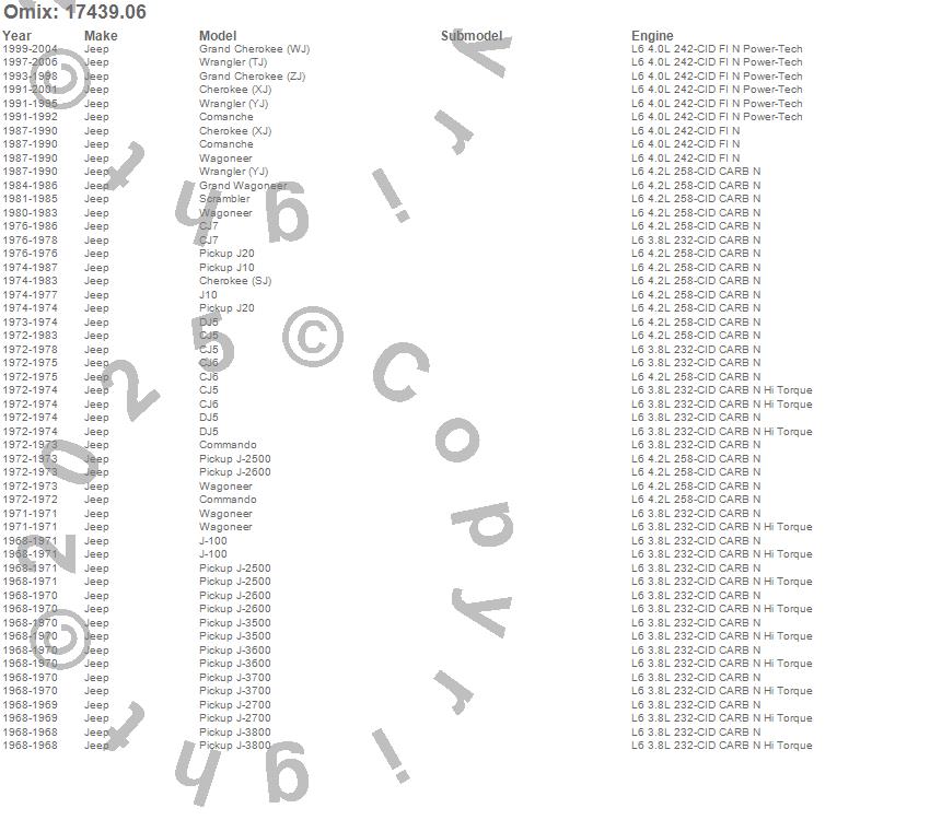 Cherokee (SJ), Cherokee (XJ), CJ5, CJ6, CJ7, Comanche, Commando, DJ5, Grand Cherokee (WJ), Grand Cherokee (ZJ), Grand Wagoneer, J-100, J-2500, J-2600, J-2700, J-3500, J-3600, J-3700, J-3800, J10