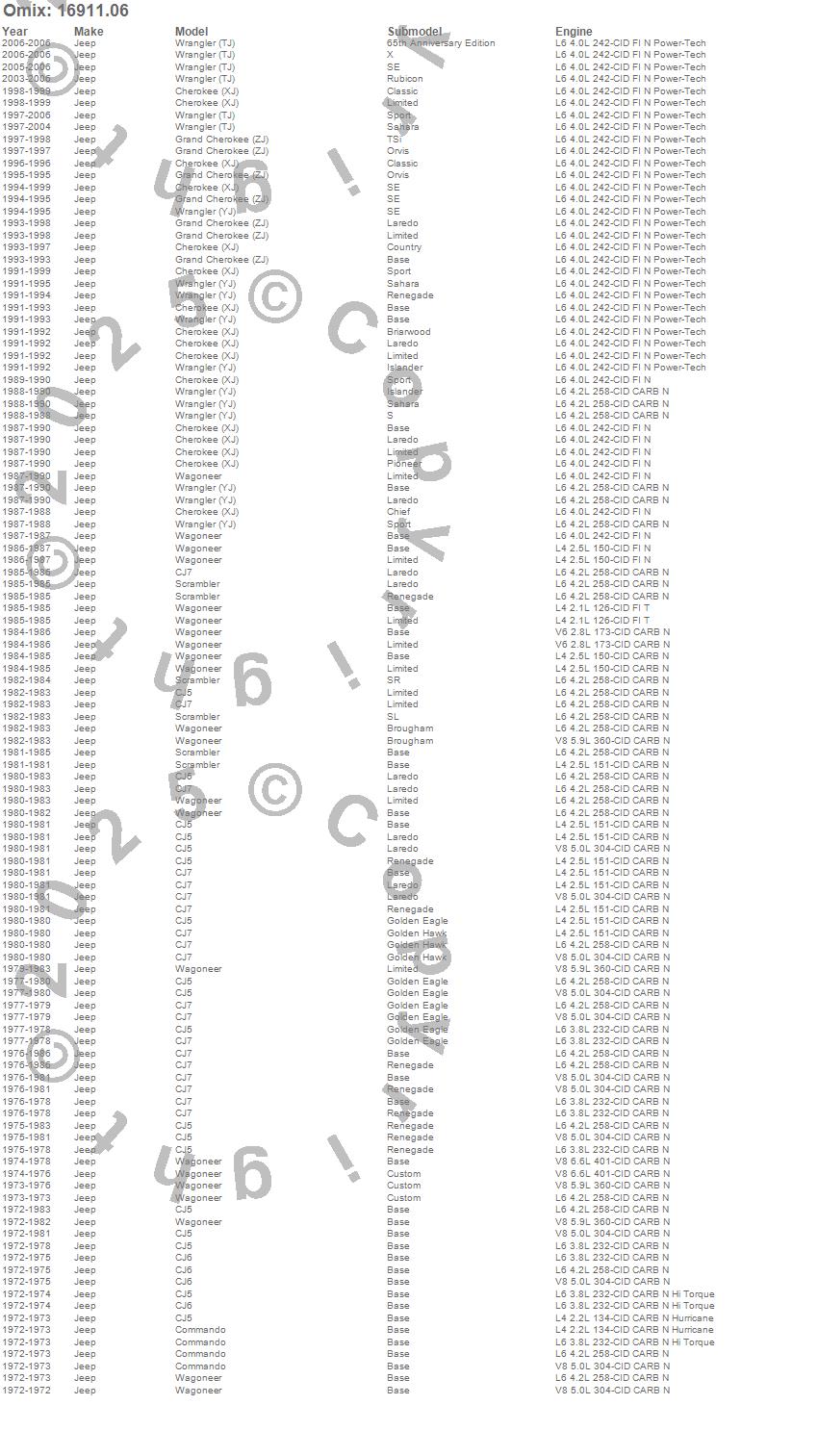 Cherokee (XJ), CJ5, CJ6, CJ7, Commando, Grand Cherokee (ZJ), Scrambler, Wagoneer, Wrangler (TJ), Wrangler (YJ), Jeep, 2006, 2005, 2004, 2003, 2002, 2001, 2000, 1999, 1998