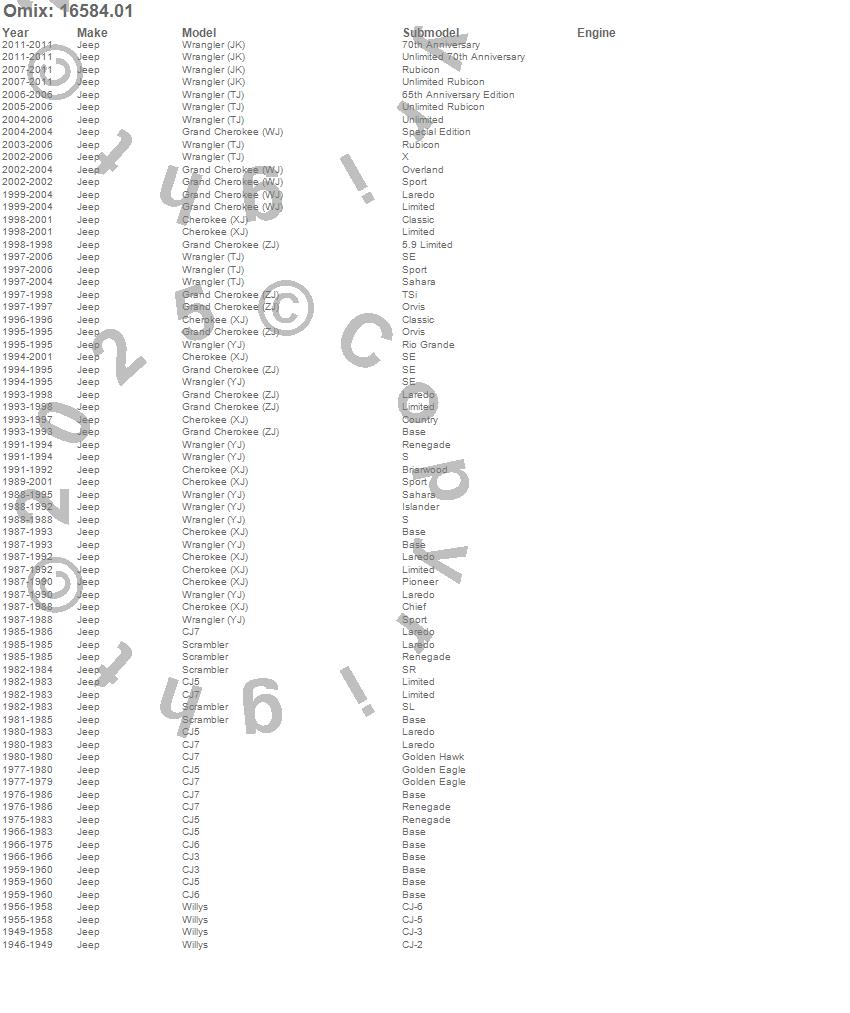 Cherokee (XJ), CJ3, CJ5, CJ6, CJ7, Grand Cherokee (WJ), Grand Cherokee (ZJ), Scrambler, Willys, Wrangler (JK), Wrangler (LJ), Wrangler (TJ), Wrangler (YJ), Jeep, 2011, 2010, 2009, 2008, 2007, 2006