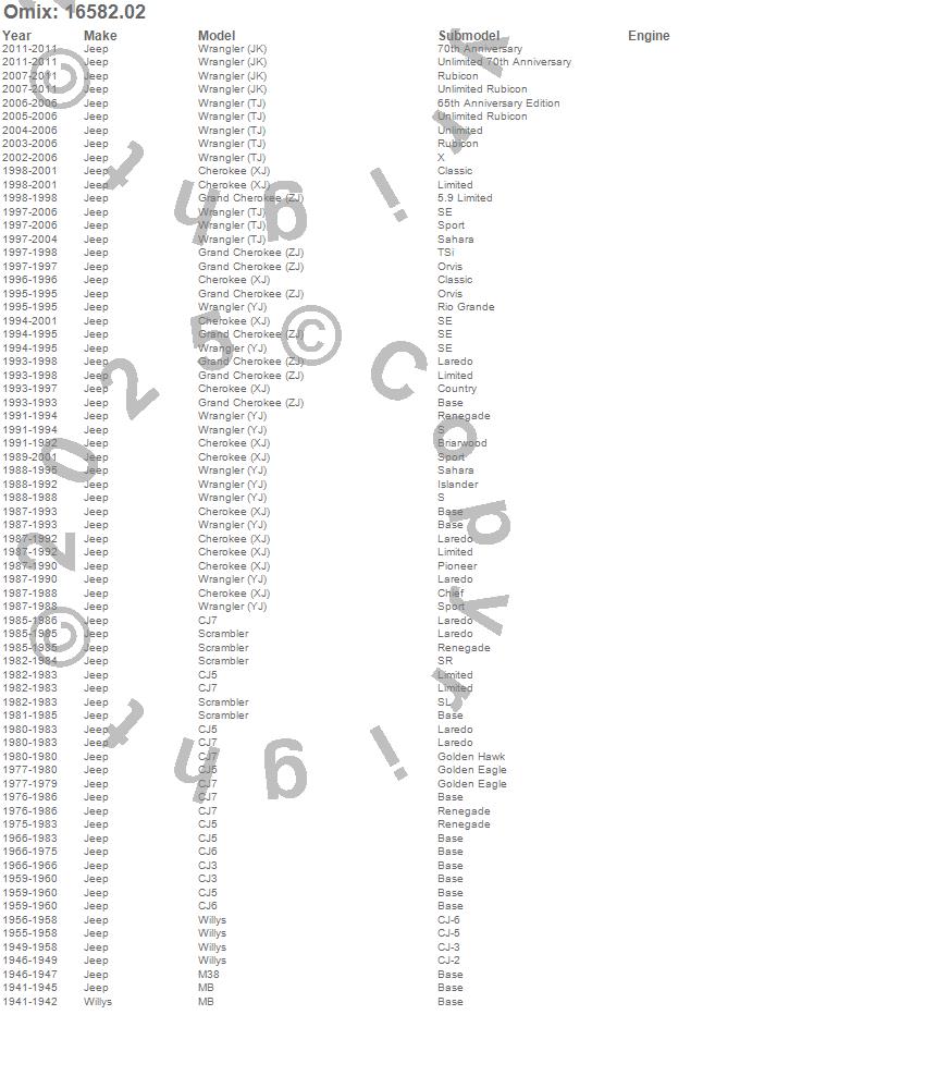 Cherokee (XJ), CJ3, CJ5, CJ6, CJ7, Grand Cherokee (ZJ), M38, MB, Scrambler, Willys, Wrangler (JK), Wrangler (LJ), Wrangler (TJ), Wrangler (YJ), Jeep, Willys, 2011, 2010, 2009, 2008
