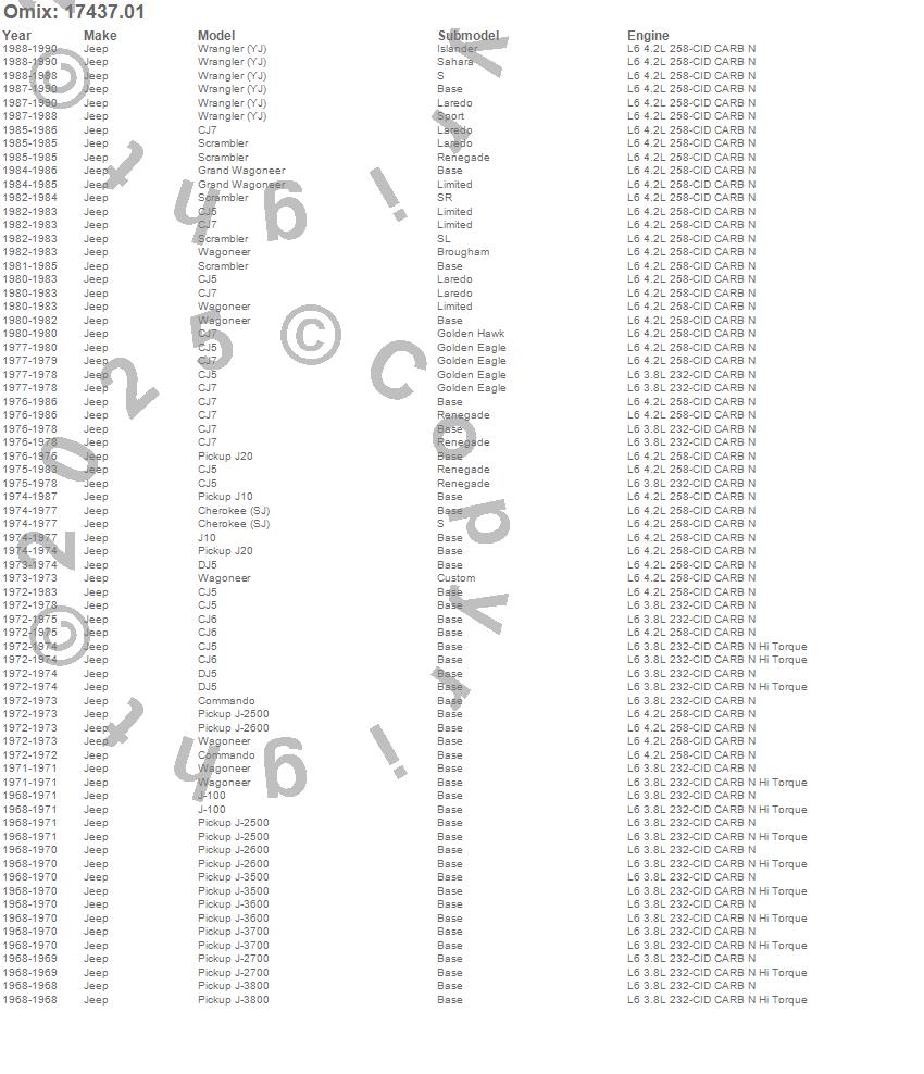Cherokee (SJ), CJ5, CJ6, CJ7, Commando, DJ5, Grand Wagoneer, J-100, J-2500, J-2600, J-2700, J-3500, J-3600, J-3700, J-3800, J10, J20, Scrambler, Wagoneer, Wrangler (YJ)