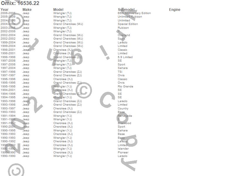 Cherokee (XJ), Grand Cherokee (WJ), Grand Cherokee (ZJ), Wrangler (LJ), Wrangler (TJ), Wrangler (YJ), Jeep, 2006, 2005, 2004, 2003, 2002, 2001, 2000, 1999, 1998, 1997, 1996, 1995, 1994