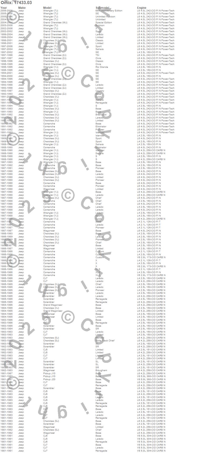Cherokee (SJ), Cherokee (XJ), CJ5, CJ7, Comanche, Grand Cherokee (WJ), Grand Cherokee (ZJ), Grand Wagoneer, J10, J20, Scrambler, Wagoneer, Wrangler (LJ), Wrangler (TJ), Wrangler (YJ), Jeep, 2006, 2005, 2004, 2003