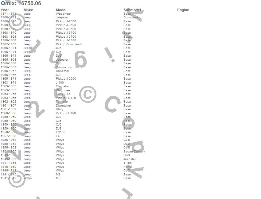 CJ3, CJ5, CJ6, Commando, Dispatcher, DJ3, DJ5, DJ6, F4, FC150, FC170, FC170HD, Gladiator, J-100, J-2500, J-2600, J-2700, J-3500, J-3600, J-3700