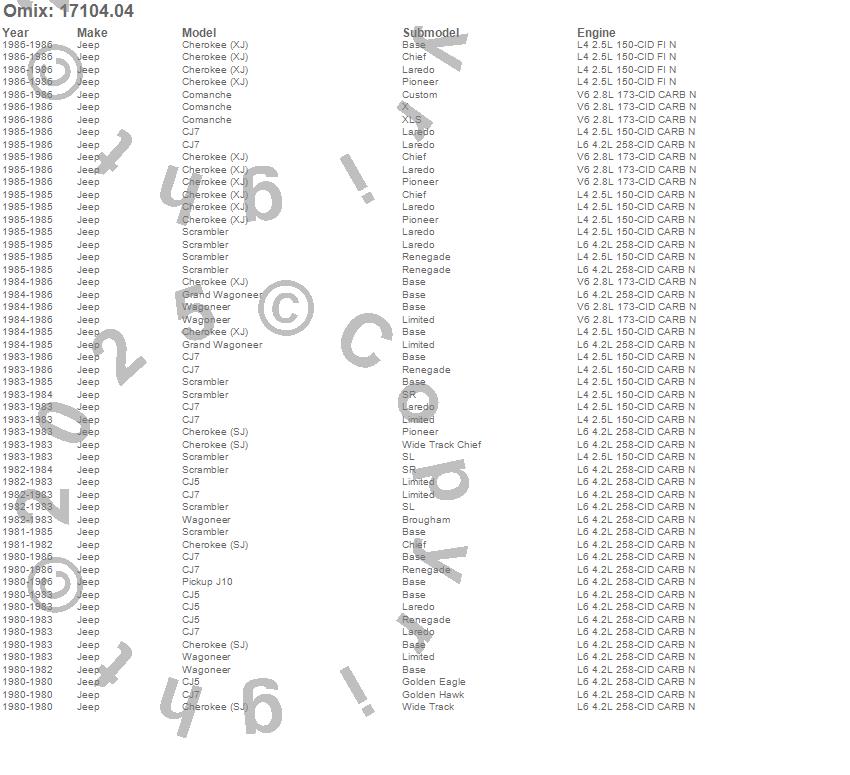 Cherokee (SJ), Cherokee (XJ), CJ5, CJ7, Comanche, Grand Wagoneer, J10, Scrambler, Wagoneer, Jeep, 1986, 1985, 1984, 1983, 1982, 1981, 1980