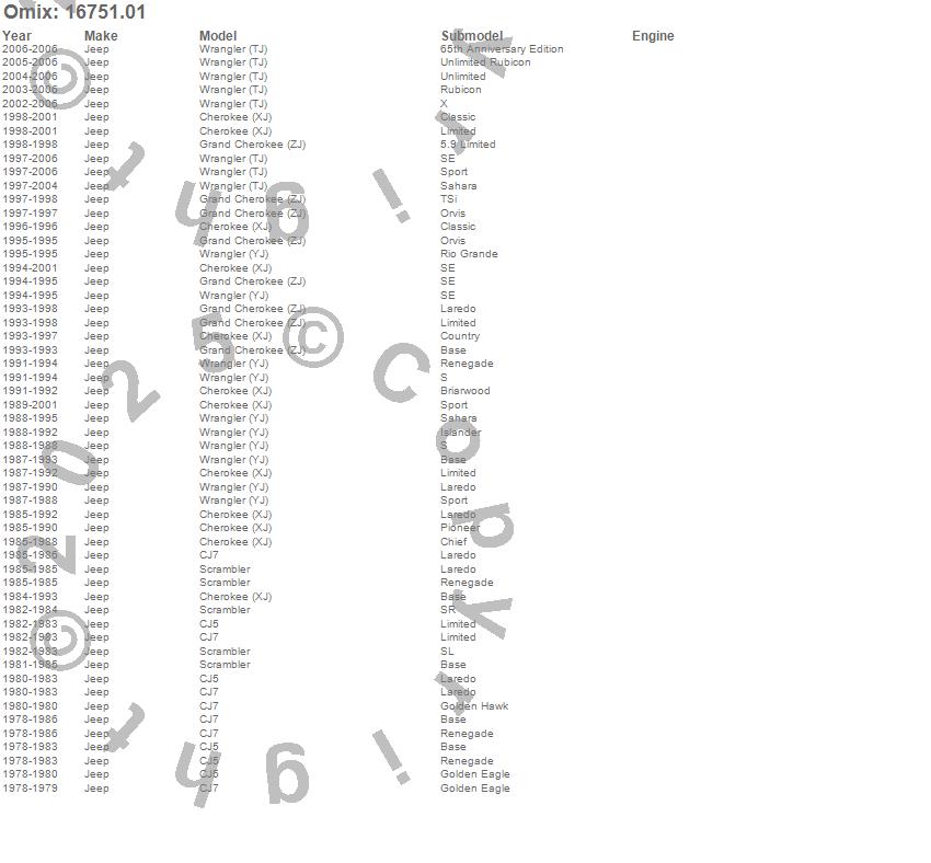 Cherokee (XJ), CJ5, CJ7, Grand Cherokee (ZJ), Scrambler, Wrangler (LJ), Wrangler (TJ), Wrangler (YJ), Jeep, 2006, 2005, 2004, 2003, 2002, 2001, 2000, 1999, 1998, 1997, 1996