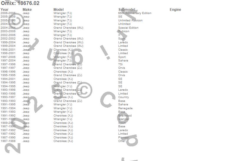 Cherokee (XJ), Grand Cherokee (WJ), Grand Cherokee (ZJ), Wrangler (LJ), Wrangler (TJ), Wrangler (YJ), Jeep, 2006, 2005, 2004, 2003, 2002, 2001, 2000, 1999, 1998, 1997, 1996, 1995, 1994