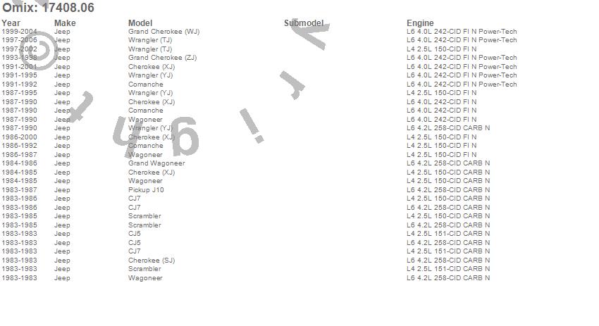Cherokee (SJ), Cherokee (XJ), CJ5, CJ7, Comanche, Grand Cherokee (WJ), Grand Cherokee (ZJ), Grand Wagoneer, J10, Scrambler, Wagoneer, Wrangler (LJ), Wrangler (TJ), Wrangler (YJ), Jeep, 2006, 2005, 2004, 2003, 2002