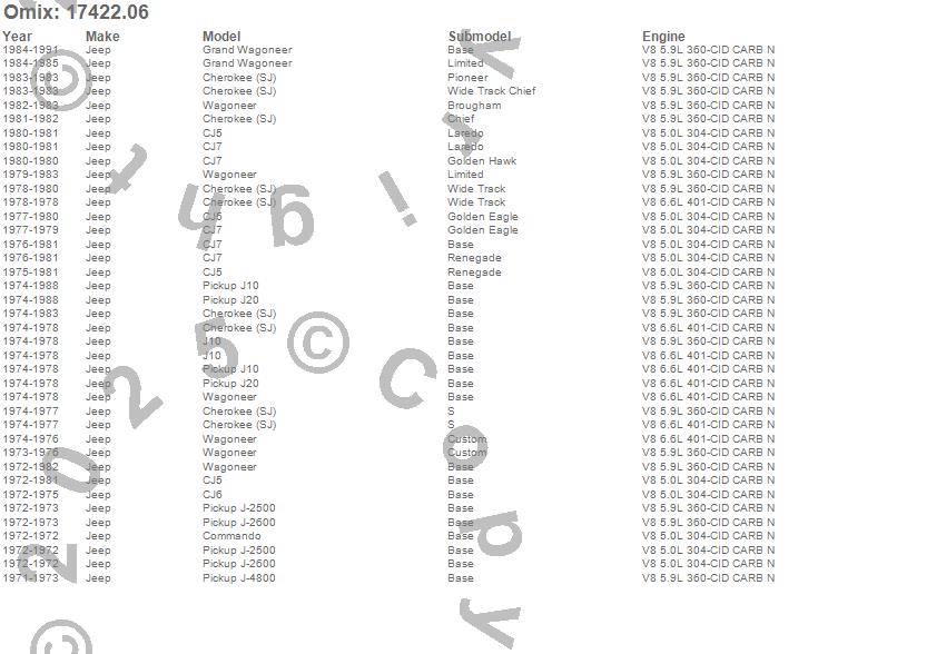 Cherokee (SJ), CJ5, CJ6, CJ7, Commando, Grand Wagoneer, J-2500, J-2600, J-4800, J10, J20, Wagoneer, Jeep, 1991, 1990, 1989, 1988, 1987, 1986, 1985