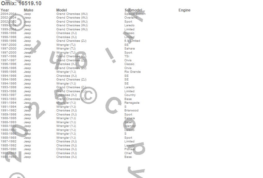 Cherokee (XJ), Grand Cherokee (WJ), Grand Cherokee (ZJ), Wrangler (TJ), Wrangler (YJ), Jeep, 2004, 2003, 2002, 2001, 2000, 1999, 1998, 1997, 1996, 1995, 1994, 1993, 1992, 1991