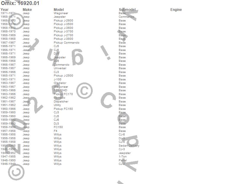 CJ3, CJ5, CJ6, Commando, Dispatcher, DJ3, DJ5, DJ6, F4, FC150, FC170, FC170HD, Gladiator, J-100, J-2500, J-2600, J-2700, J-3500, J-3600, J-3700