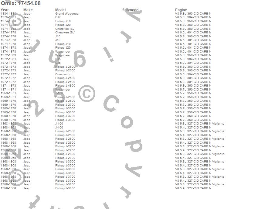 Cherokee (SJ), CJ5, CJ6, CJ7, Commando, Grand Wagoneer, J-100, J-2500, J-2600, J-2700, J-2800, J-3500, J-3600, J-3700, J-3800, J-4800, J10, J20, Wagoneer, Jeep