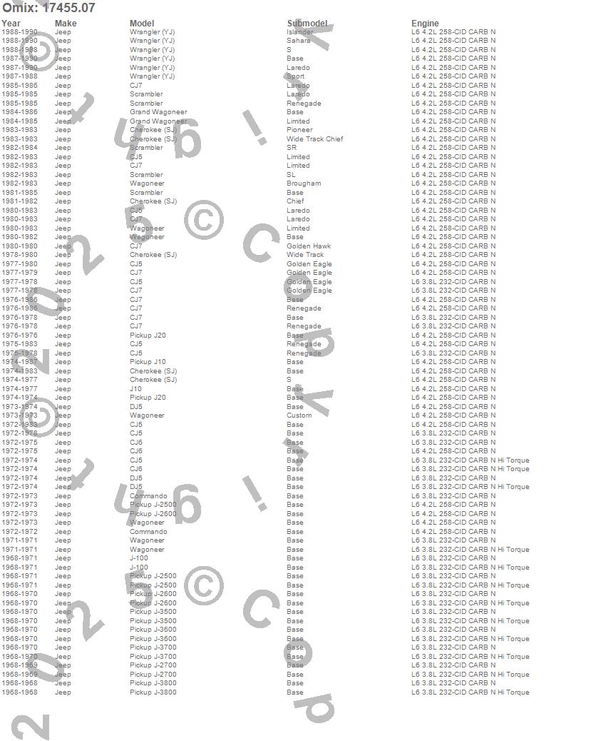Cherokee (SJ), CJ5, CJ6, CJ7, Commando, DJ5, Grand Wagoneer, J-100, J-2500, J-2600, J-2700, J-3500, J-3600, J-3700, J-3800, J10, J20, Scrambler, Wagoneer, Wrangler (YJ)