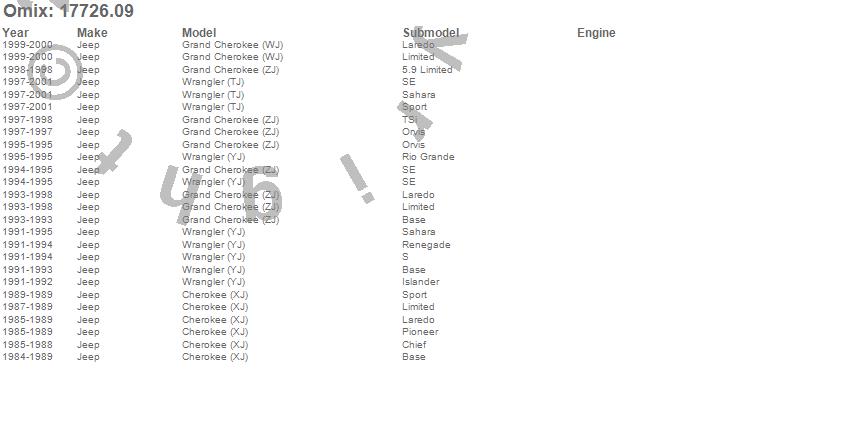 Cherokee (XJ), Grand Cherokee (WJ), Grand Cherokee (ZJ), Wrangler (TJ), Wrangler (YJ), Jeep, 2001, 2000, 1999, 1998, 1997, 1996, 1995, 1994, 1993, 1992, 1991, 1989, 1988, 1987