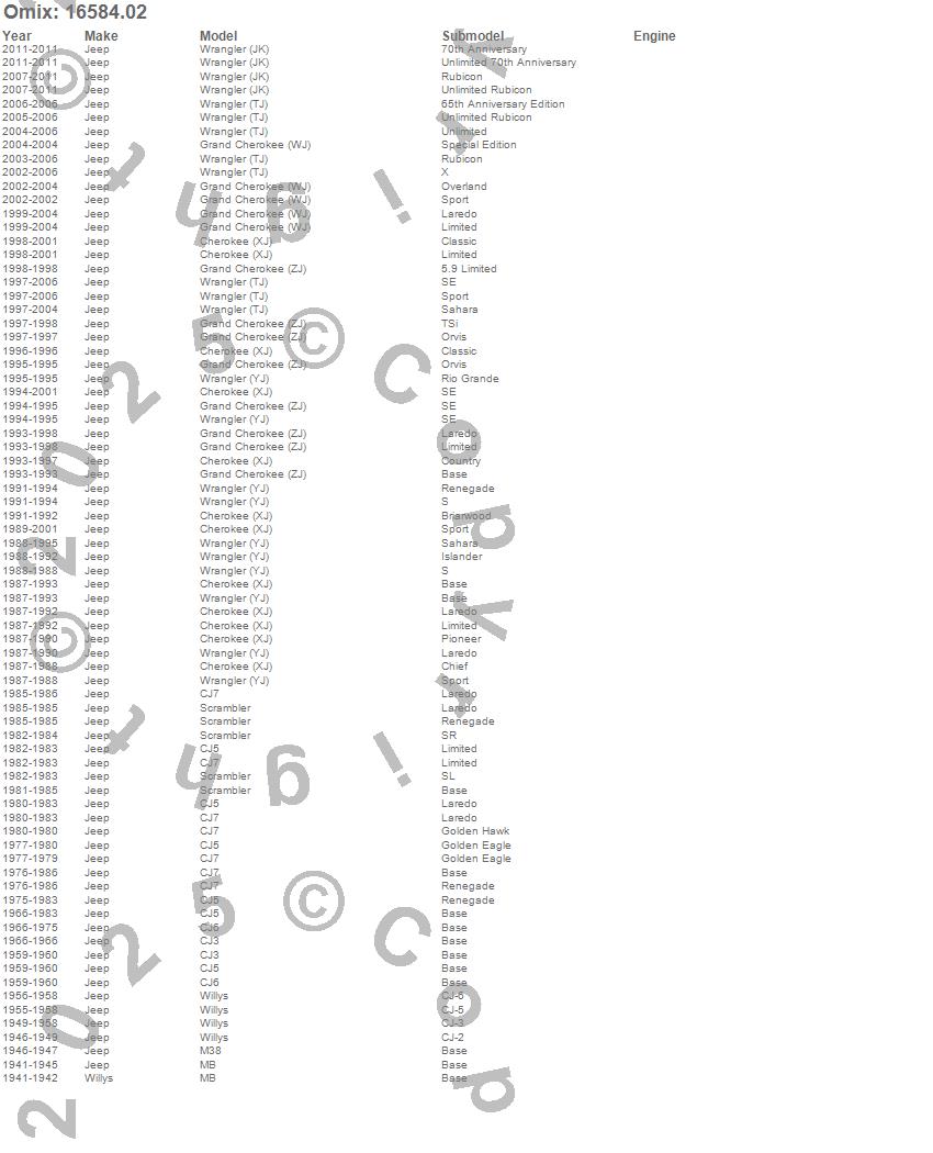 Cherokee (XJ), CJ3, CJ5, CJ6, CJ7, Grand Cherokee (WJ), Grand Cherokee (ZJ), M38, MB, Scrambler, Willys, Wrangler (JK), Wrangler (LJ), Wrangler (TJ), Wrangler (YJ), Jeep, Willys, 2011, 2010, 2009
