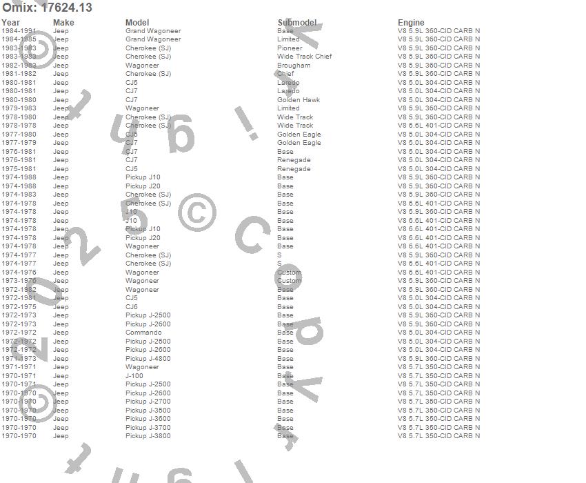 Cherokee (SJ), CJ5, CJ6, CJ7, Commando, Grand Wagoneer, J-100, J-2500, J-2600, J-2700, J-3500, J-3600, J-3700, J-3800, J-4800, J10, J20, Wagoneer, Jeep, 1991