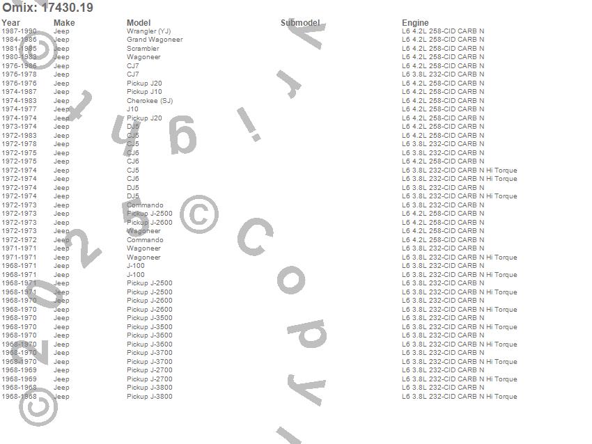 Cherokee (SJ), CJ5, CJ6, CJ7, Commando, DJ5, Grand Wagoneer, J-100, J-2500, J-2600, J-2700, J-3500, J-3600, J-3700, J-3800, J10, J20, Scrambler, Wagoneer, Wrangler (YJ)