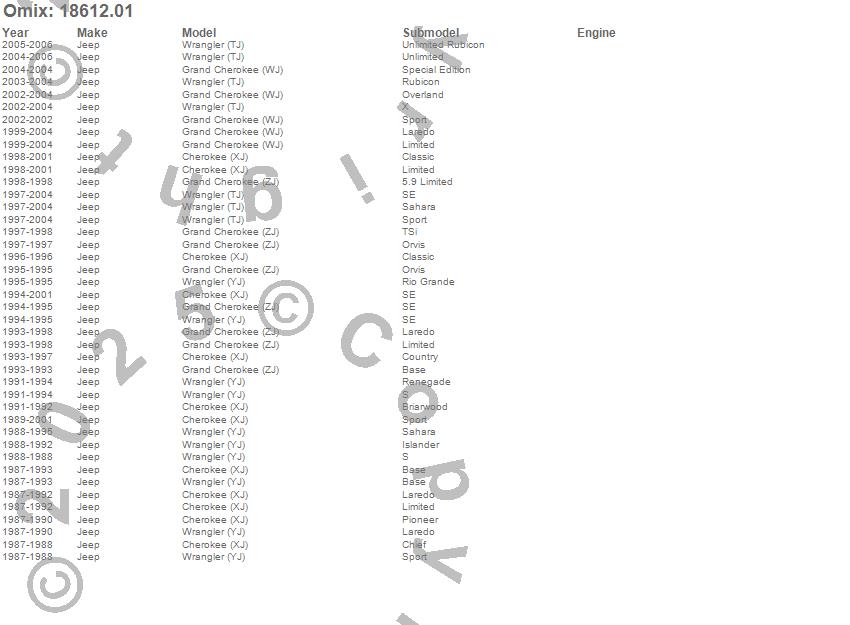 Cherokee (XJ), Grand Cherokee (WJ), Grand Cherokee (ZJ), Wrangler (LJ), Wrangler (TJ), Wrangler (YJ), Jeep, 2006, 2005, 2004, 2003, 2002, 2001, 2000, 1999, 1998, 1997, 1996, 1995, 1994