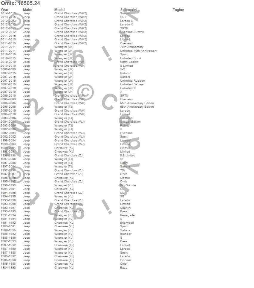 Cherokee (XJ), Grand Cherokee (WJ), Grand Cherokee (WK), Grand Cherokee (WK2), Grand Cherokee (ZJ), Wrangler (JK), Wrangler (LJ), Wrangler (TJ), Wrangler (YJ), Jeep, 2015, 2014, 2013, 2012, 2011, 2010, 2009, 2008, 2007, 2006