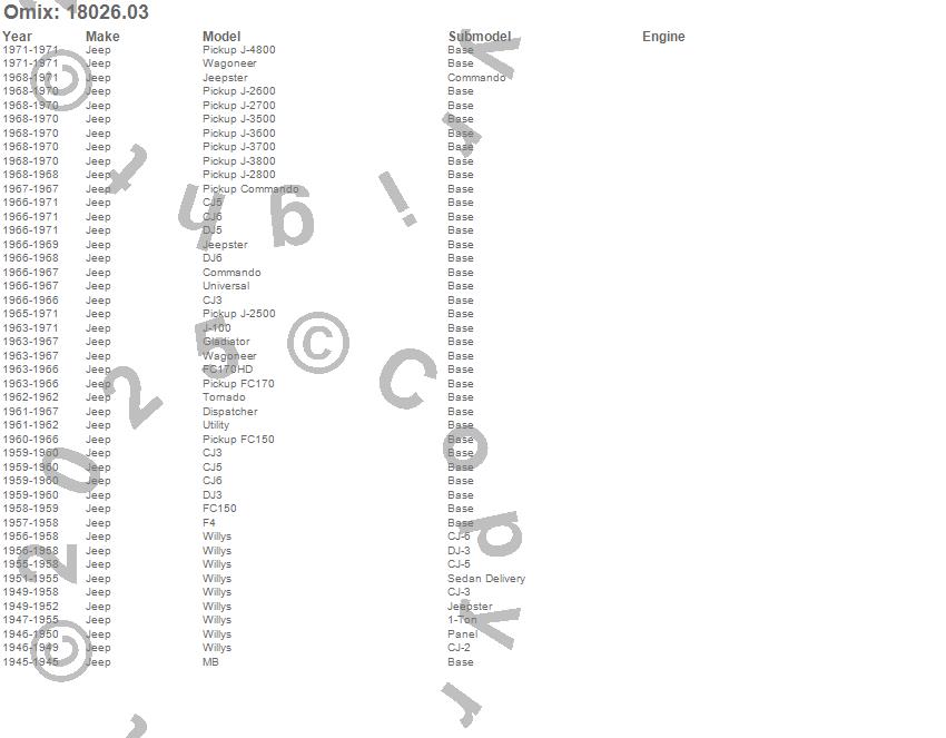 CJ3, CJ5, CJ6, Commando, Dispatcher, DJ3, DJ5, DJ6, F4, FC150, FC170, FC170HD, Gladiator, J-100, J-2500, J-2600, J-2700, J-2800, J-3500, J-3600