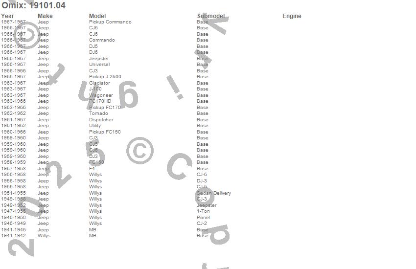 CJ3, CJ5, CJ6, Commando, Dispatcher, DJ3, DJ5, DJ6, F4, FC150, FC170, FC170HD, Gladiator, J-100, J-2500, Jeepster, MB, Tornado, Universal, Utility