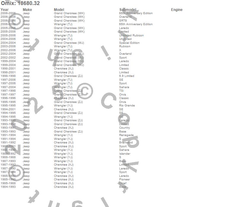 Cherokee (XJ), Grand Cherokee (WJ), Grand Cherokee (WK), Grand Cherokee (ZJ), Wrangler (LJ), Wrangler (TJ), Wrangler (YJ), Jeep, 2006, 2005, 2004, 2003, 2002, 2001, 2000, 1999, 1998, 1997, 1996, 1995