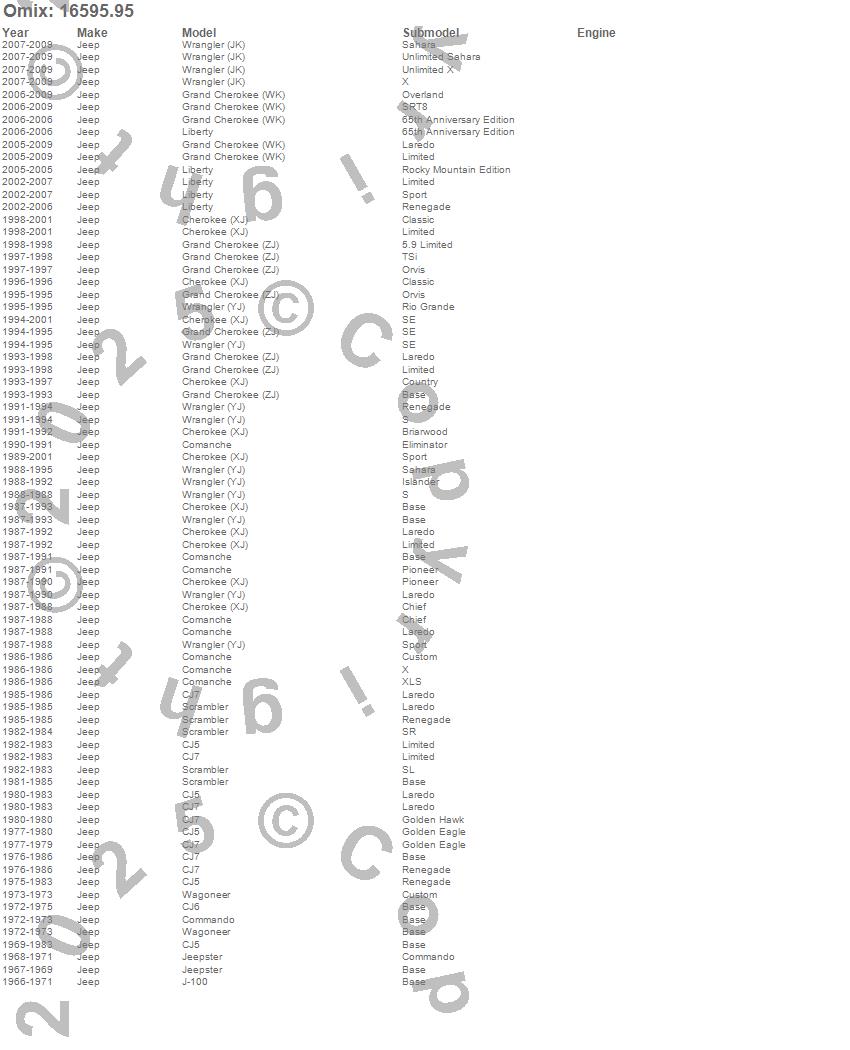 Cherokee (XJ), CJ5, CJ6, CJ7, Comanche, Commando, Grand Cherokee (WK), Grand Cherokee (ZJ), J-100, Jeepster, Liberty, Scrambler, Wagoneer, Wrangler (JK), Wrangler (YJ), Jeep, 2009, 2008, 2007, 2006