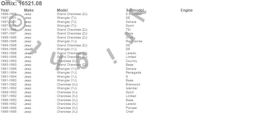 Cherokee (XJ), Grand Cherokee (ZJ), Wrangler (TJ), Wrangler (YJ), Jeep, 2001, 2000, 1999, 1998, 1997, 1996, 1995, 1994, 1993, 1992, 1991, 1990, 1989, 1988, 1987