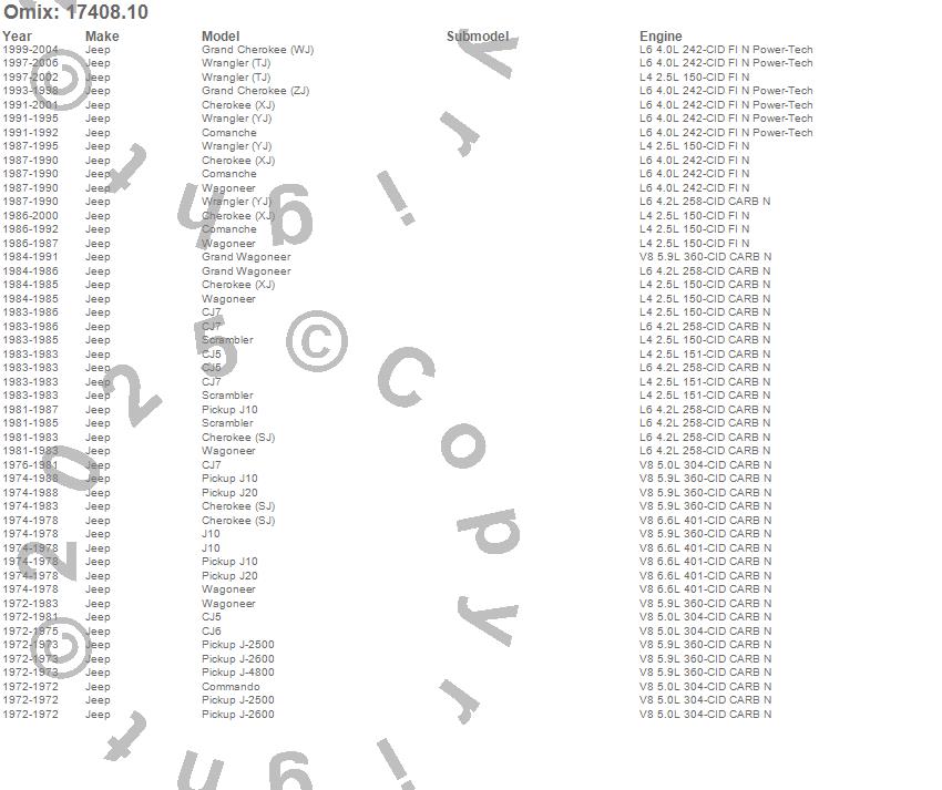 Cherokee (SJ), Cherokee (XJ), CJ5, CJ6, CJ7, Comanche, Commando, Grand Cherokee (WJ), Grand Cherokee (ZJ), Grand Wagoneer, J-2500, J-2600, J-4800, J10, J20, Scrambler, Wagoneer, Wrangler (LJ), Wrangler (TJ), Wrangler (YJ)