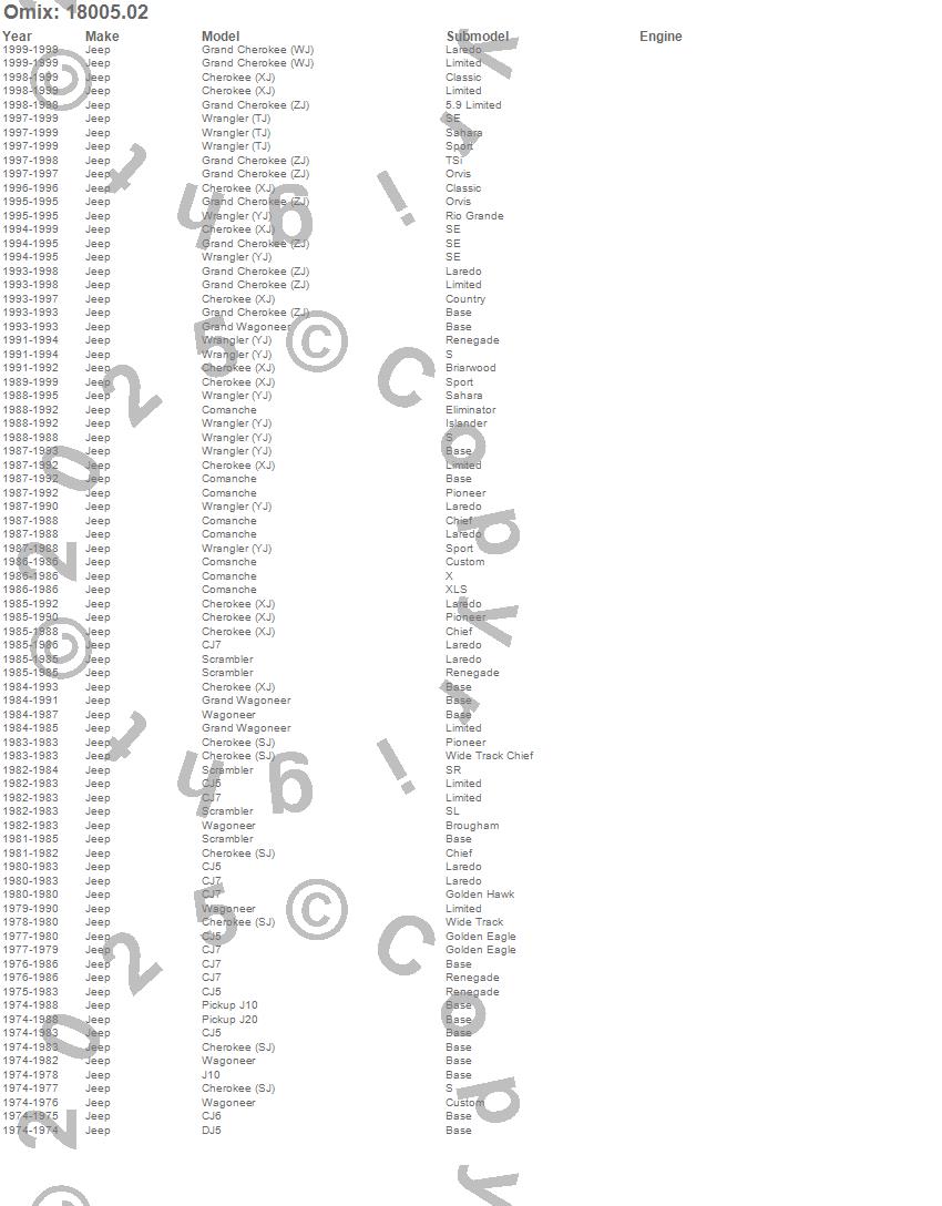 Cherokee (SJ), Cherokee (XJ), CJ5, CJ6, CJ7, Comanche, DJ5, Grand Cherokee (WJ), Grand Cherokee (ZJ), Grand Wagoneer, J10, J20, Scrambler, Wagoneer, Wrangler (TJ), Wrangler (YJ), Jeep, 1999, 1998, 1997
