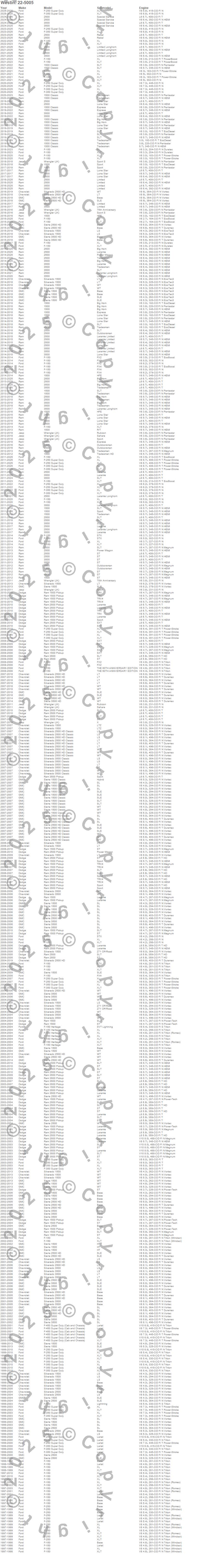 1500, 1500 Classic, 2500, 3500, F-150, F-150 Heritage, F-250, F-250 Super Duty, F-350 Super Duty, F-450 Super Duty, F-550 Super Duty, F-600 Super Duty, Ram 1500, Ram 2500, Ram 3500, Sierra 1500, Sierra 1500 Classic, Sierra 2500 HD, Sierra 2500 HD Classic, Sierra 3500