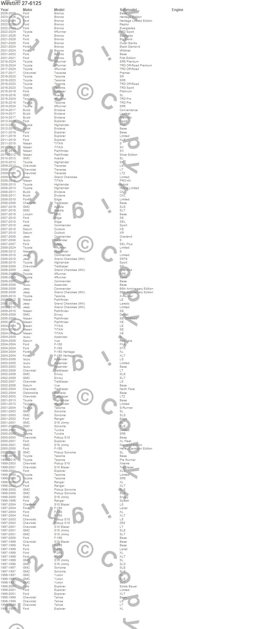 4Runner, Acadia, Ascender, Bravada, Bronco, Commander, Edge, Enclave, Envoy, Explorer, F-150, F-150 Heritage, F-250, Grand Cherokee, Grand Cherokee (WK), Highlander, MKX, Outlook, Pathfinder, Ranger