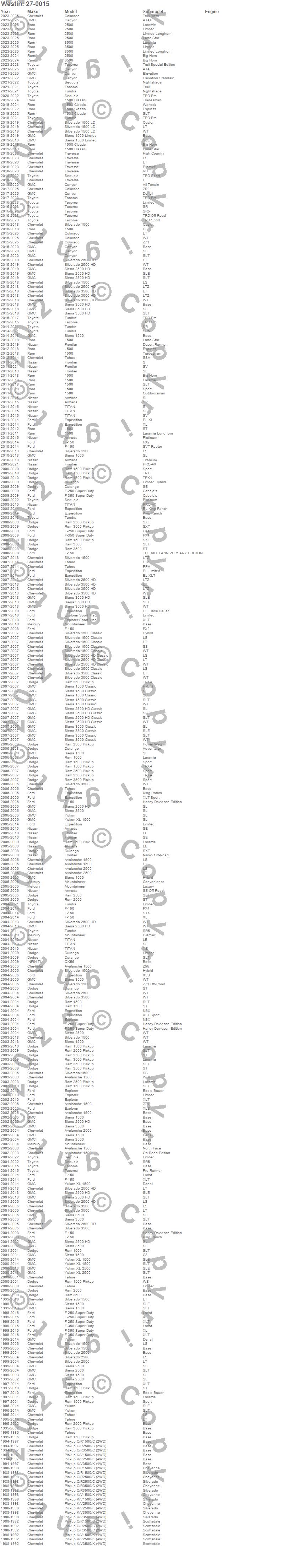 1500, 1500 Classic, Armada, Avalanche 1500, Avalanche 2500, C1500 Pickup, C2500 Pickup, C3500 Pickup, Canyon, Colorado, Durango, Expedition, Explorer, Explorer Sport Trac, F-150, F-250 Super Duty, F-350 Super Duty, Frontier, K1500 Pickup, K2500 Pickup
